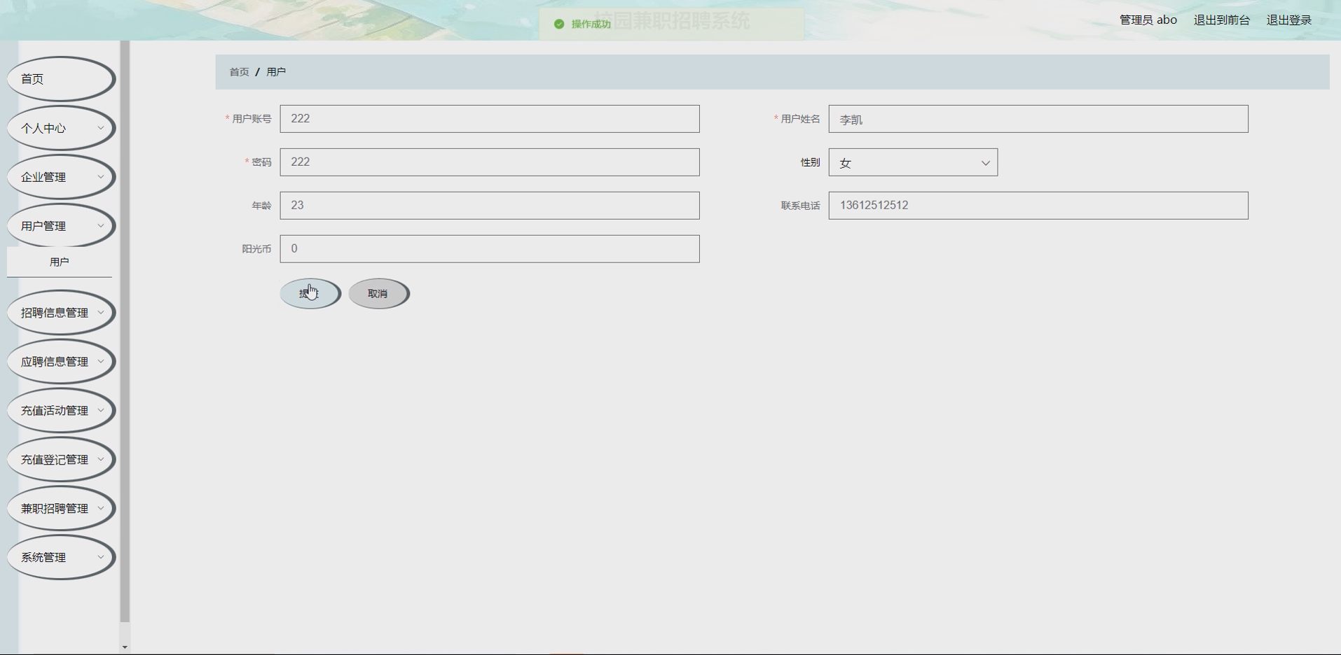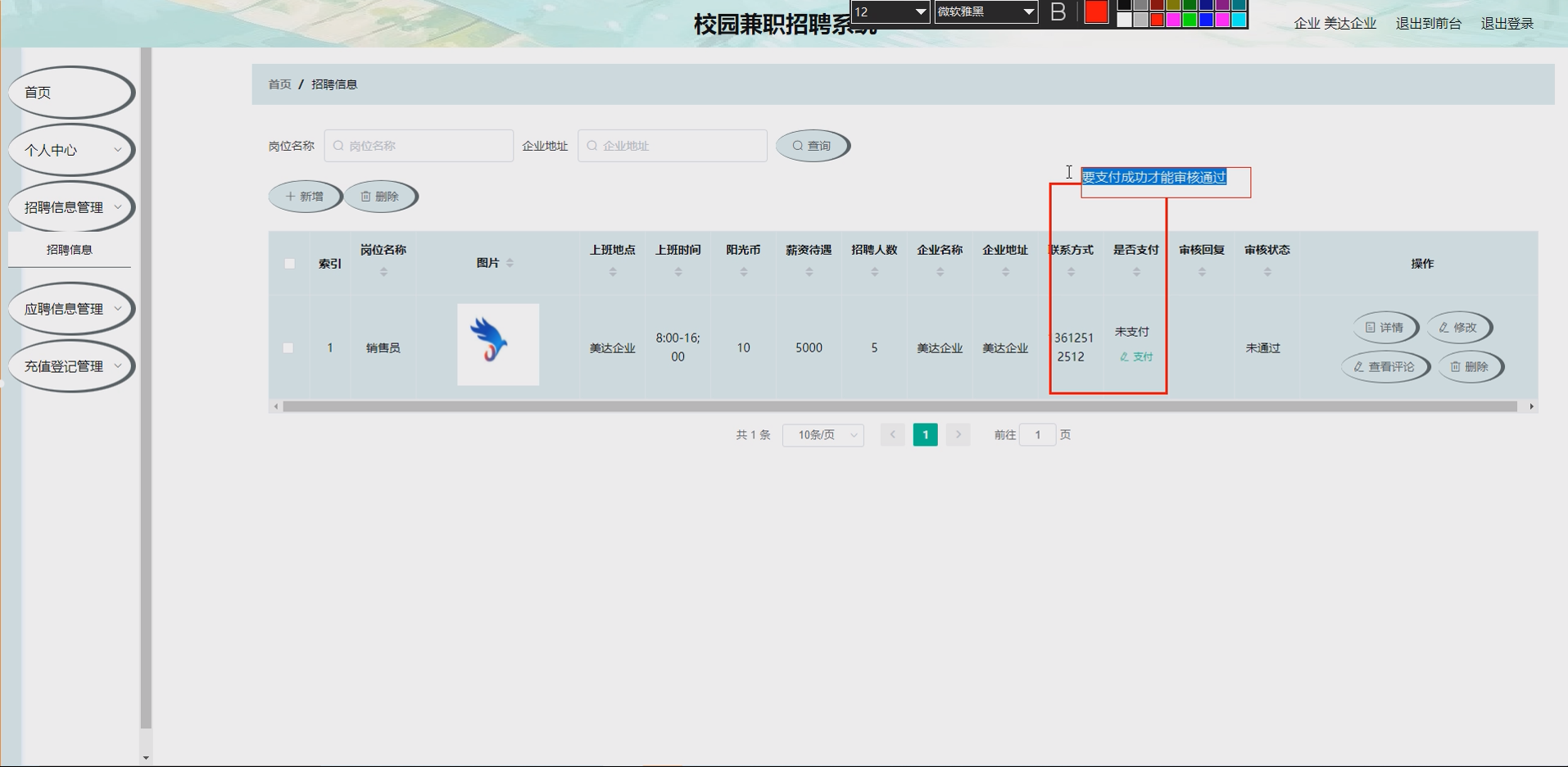 系统项目功能:企业,用户,招聘信息,应聘信息,充值活动,充值登记,兼职招聘