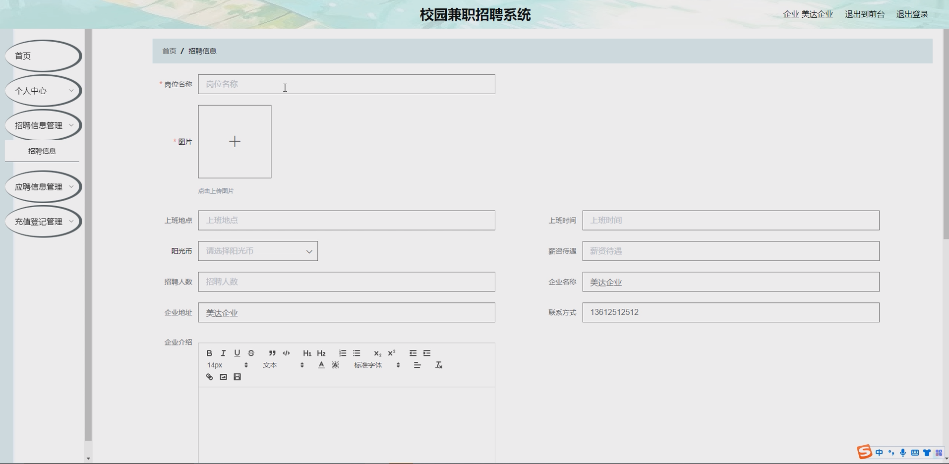 支持企业注册、登录、资质审核、信息修改。企业需提交营业执照等材料,经管理员审核通过后,方可发布招聘信息、参与充值活动,同时可管理自身招聘记录与应聘信息。