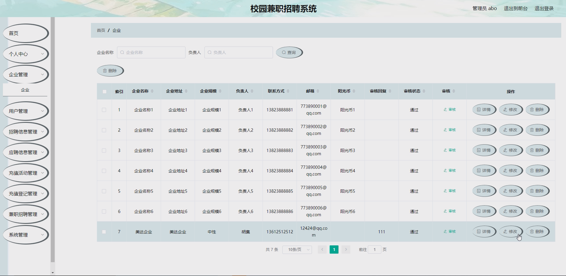 设计并实现一款基于SSM框架的校园兼职招聘系统,涵盖企业、用户、招聘信息、应聘信息、充值活动、充值登记及兼职招聘七大核心功能,实现校园兼职招聘全流程线上化、规范化管理,提升招聘与求职效率,兼顾企业推广需求与学生权益保障。