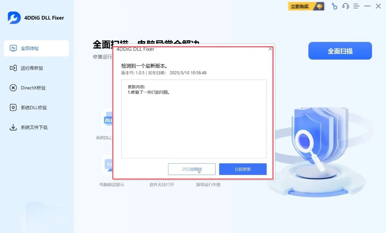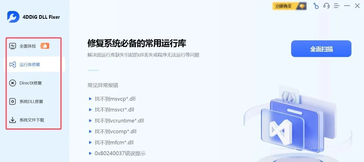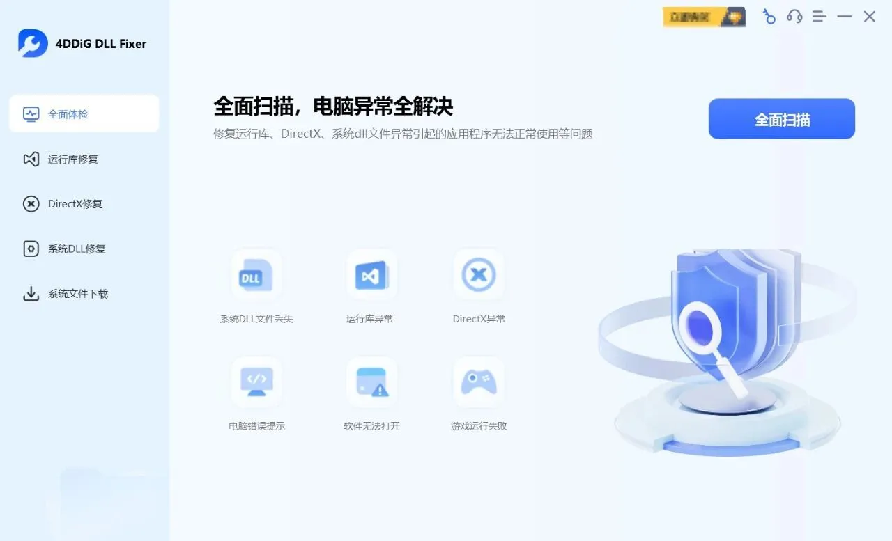 | 全面体检修复 | 深度扫描系统所有 DLL 相关问题,一键修复 | 系统整体不稳定、多种程序同时出现错误 |