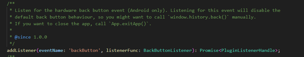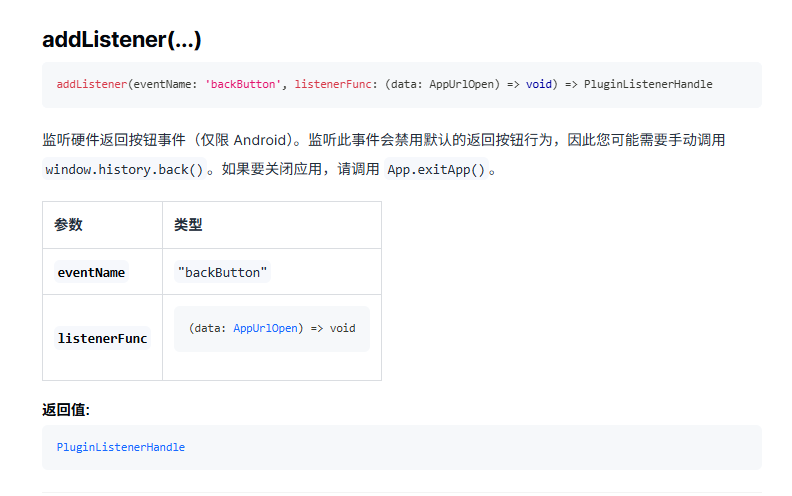 2、addListener(' backButton**', async () => {})使用方法参考 capacitor 官方文档:**