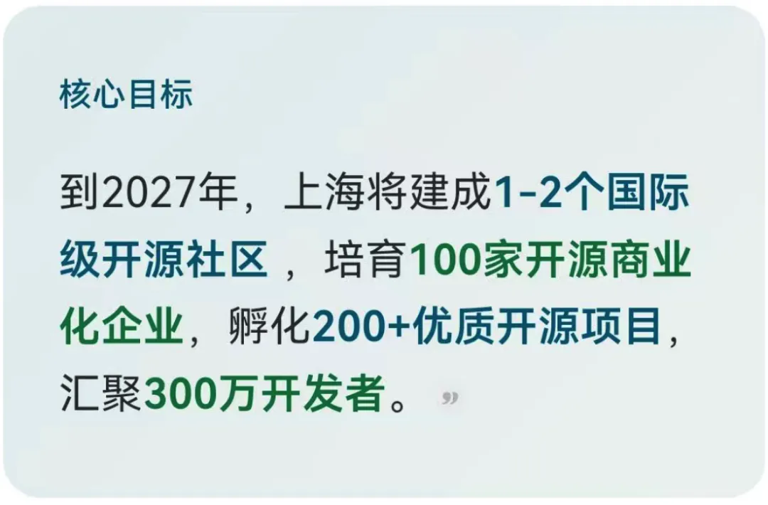 - 企业方面,推动市属国企将开源成果与职称评聘、晋升挂钩,并研究将开源人才纳入上海市急需紧缺目录。