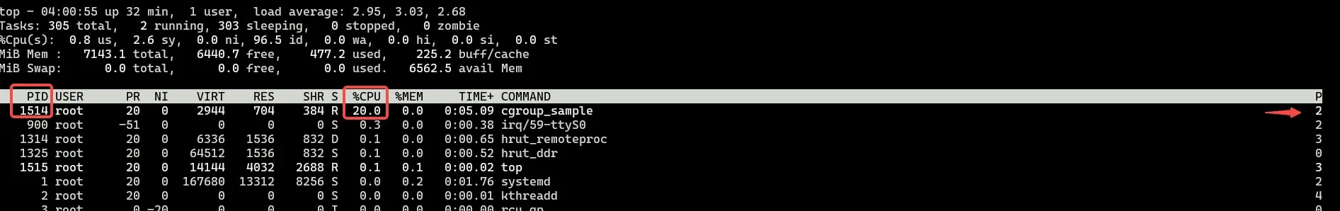 root@hobot:~# /app/sample/S83_Sample/S83E03_BaseService/cgroup_sample/bin/cgroup_sample -c 20 -C 2 -t 20 &[1] 1514