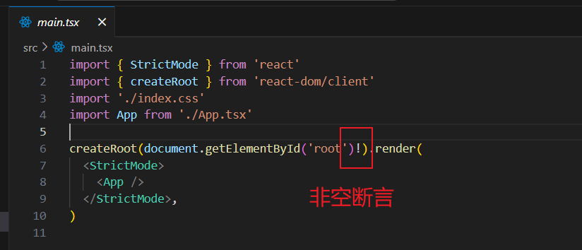 为什么main.tsx的document.getElementById('root')!要加一个!
