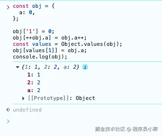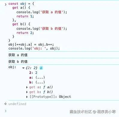 obj.a的值, 取到的值为1, 然后执行前置递增++obj.a,结果为2,然后程序就知道要往obj的2属性上赋值了。 - 第二步,然后再取