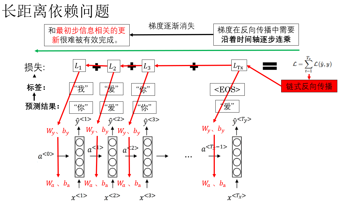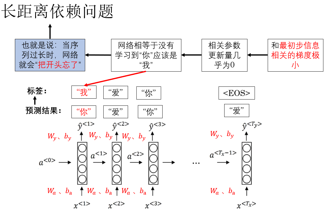 注意我们标红的字体:当序列过长时,与结尾距离很远的最初几步信息很难实现有效更新。因此梯度已经在层层连乘中所剩无几了。