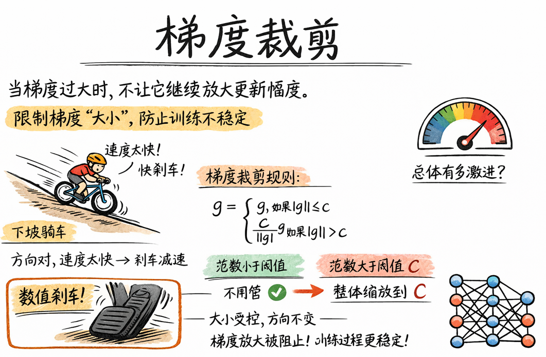 | 梯度裁剪(Gradient Clipping) | 当梯度范数超过阈值 \(c\) 时,对梯度整体缩放,使其范数等于 \(c\);不改变梯度方向,只调整大小 | 就像给过快下坡的车装刹车,保持安全速度 |