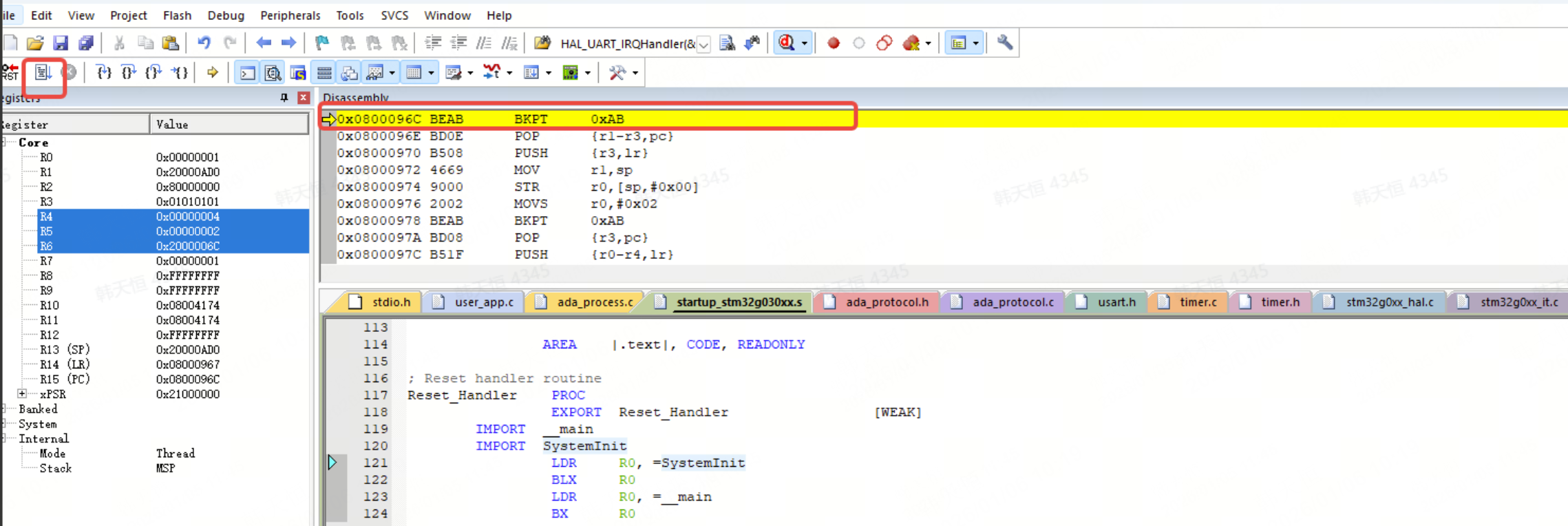 5. 发现单步调试时,按下了RUN之后经常停留在 BKPT(断点)处