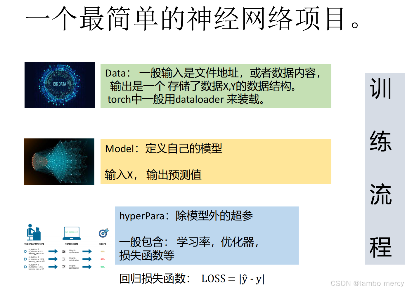 **训练数据(Training Data):**通过数据处理部分(data process),得到x和真实值y,让x通过模型Model得到一个预测值y尖,y与y尖通过处理得到loss,再让loss乘以学习率lr,就可以得到梯度grad,这个模型就可更新,以使得下一次得到的预测值更靠近真实值y。