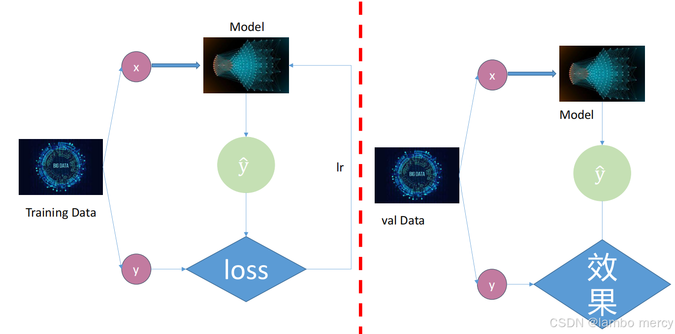 **验证数据(Val Data ):**让x通过模型Model得到一个预测值y尖,y与y尖进行一次计算得到一个效果的判断,在验证集上不更新模型,故理论上说模型的参数与验证集的数据无关。