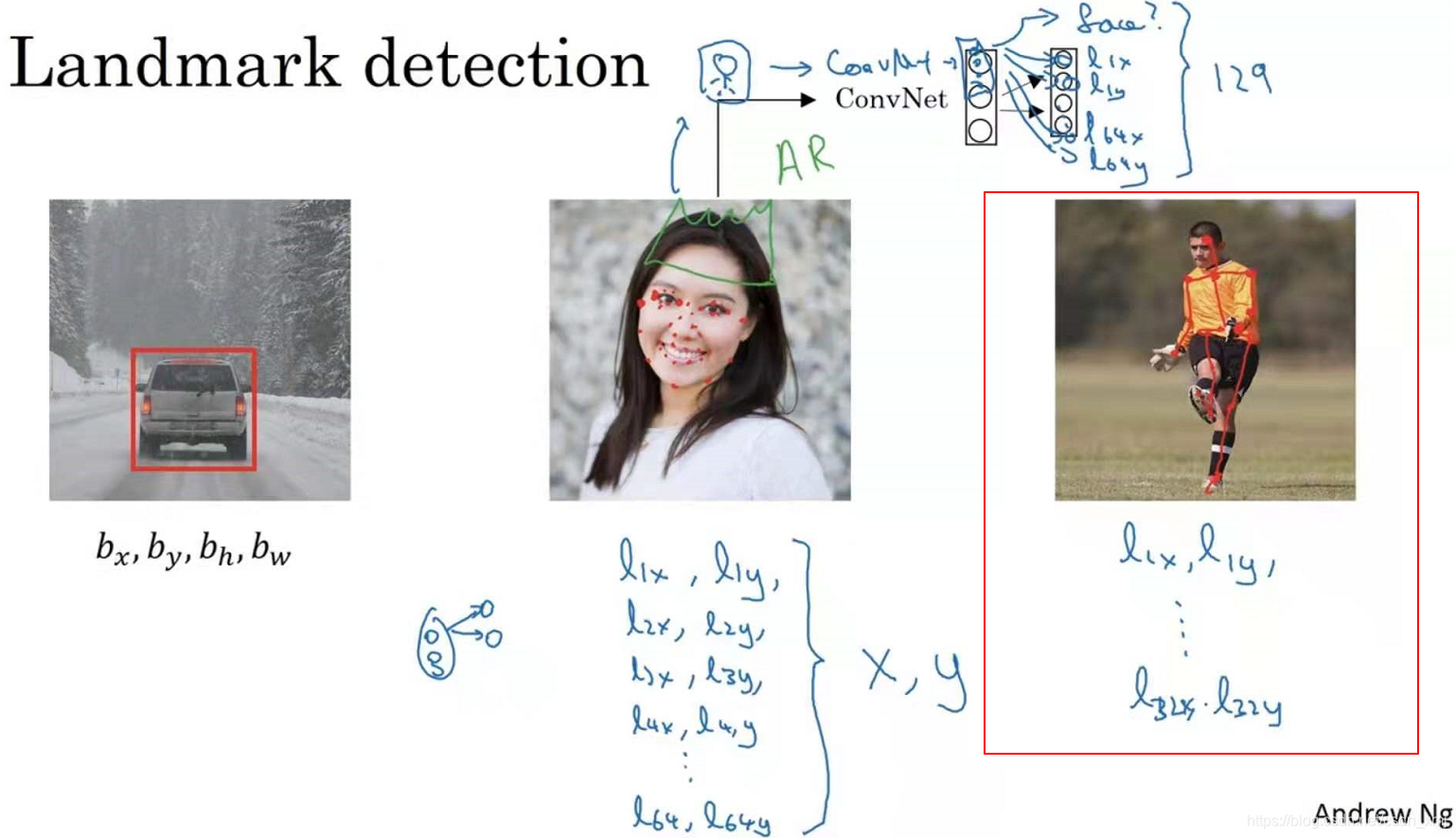 - 对于分类定位问题,可以让神经网络多输出几个单元,来表示一个边界框。具体就是让神经网络再多输出4个数字,标记为b_x,b_y,b_h,b_w。