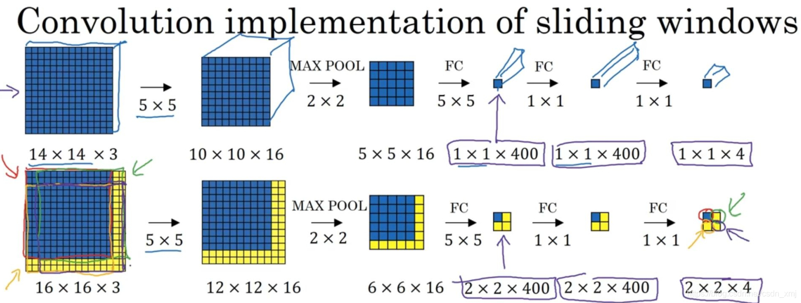 - 对于测试的理解:不用管中间步骤和通道数,只看输入和输出,可以看做在16×16测试图像上使用14×14的滑动窗口,步幅为2,最终的输出可看做4个位置的检测结果