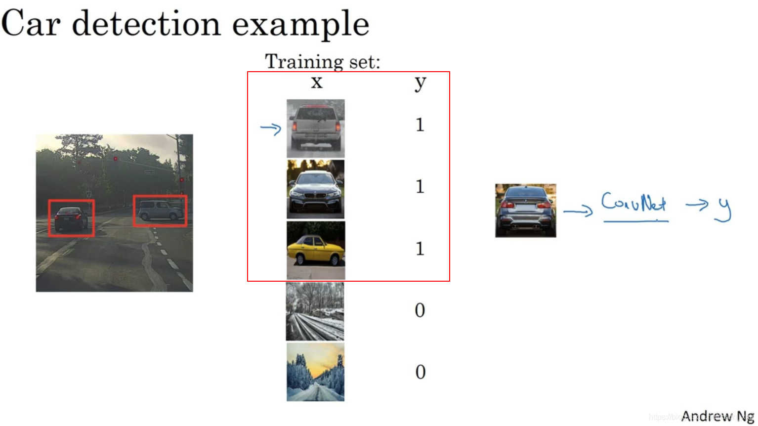 构建一个汽车检测算法,用裁剪后的汽车图片做样本,构建训练集,训练一个普通的汽车分类器(卷积神经网络),然后使用滑动窗口目标检测。
