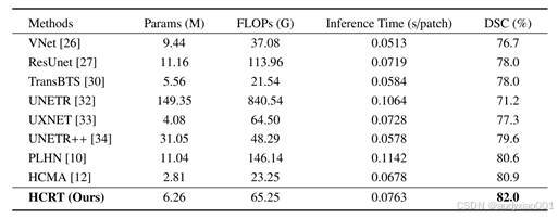 在表3网络复杂度方面, HCRT在参数量、计算量和推理速度上表现平衡。与PLHN(11.04M 参数、146.14G FLOPs、0.1142s/patch)和UNETR++(31.05M参数、79.6% DSC、0.0578 s/patch)相比,HCRT仅使用6.26M参数、65.25G FLOPs,但DSC达到82.0%,推理时间为0.0763 s/patch,兼顾高精度与效率。与HCMA相比,HCRT尽管计算量略高,但分割精度更优,说明其在提升模型性能的同时未显著增加计算开销。整体来看,HCRT不仅实现了更准确的乳腺肿瘤分割,也保持了合理的计算成本和推理效率。