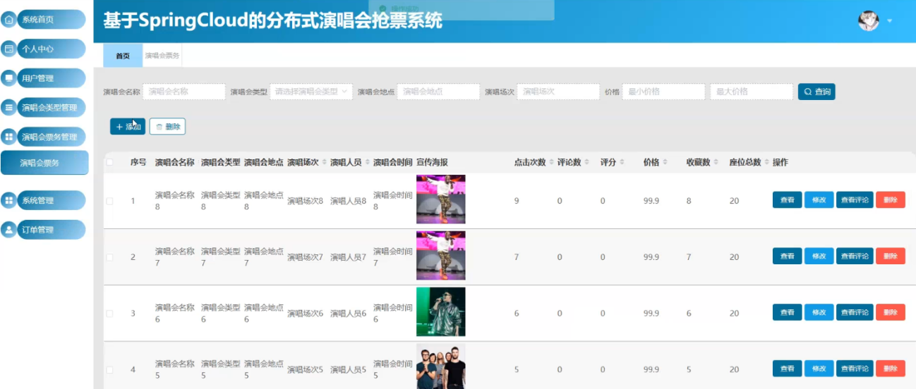 - 票务查询:可通过演唱会名称、地点、场次、价格等条件筛选查询,查看演唱会详情(名称、类型、地点、人员、时间、海报、介绍等);