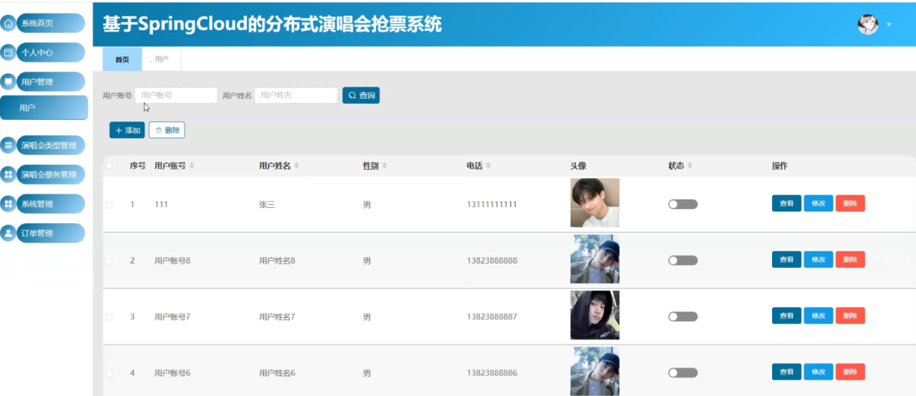 - 用户管理:对用户账号信息进行查询、添加、修改、删除操作;