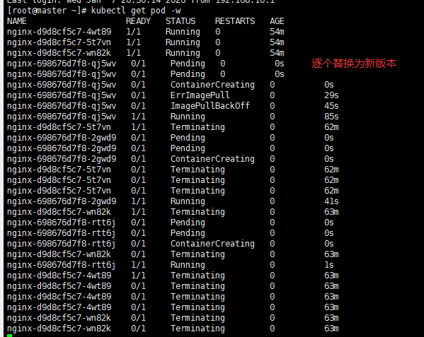kubectl get pods -w #/处于动态监听 pod 状态,由于使用的是滚动更新方式,所以会先生成一个新