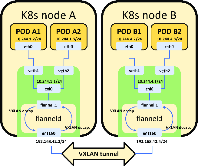 VXLAN 模式下作是由内核进行的。flannel 不转发数据,仅动态设置 ARP 表和 MAC 表项。