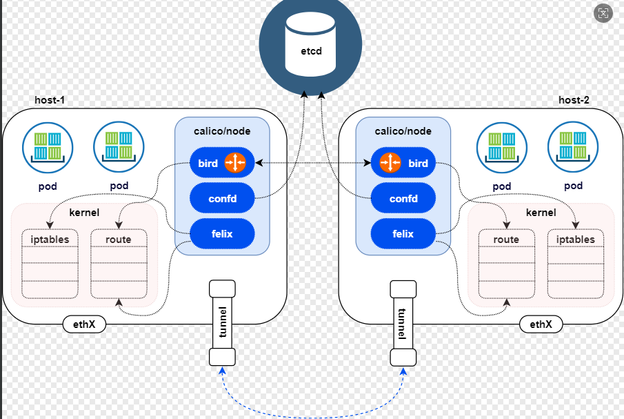 这些路由规则都是 Felix 维护配置的,而路由信息则是 Calico BIRD 组件基于 BGP 分发而来。