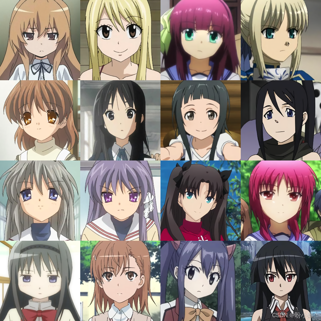 (1) 首先加载数据集,使用 Hugging Face 加载名为 se/fie2anime 的动漫人脸数据集。该数据集原本用于训练真人面部图像转动漫面部图像的模型,但本节仅使用其中的动漫图像部分(我们也可选择使用真人图像部分):