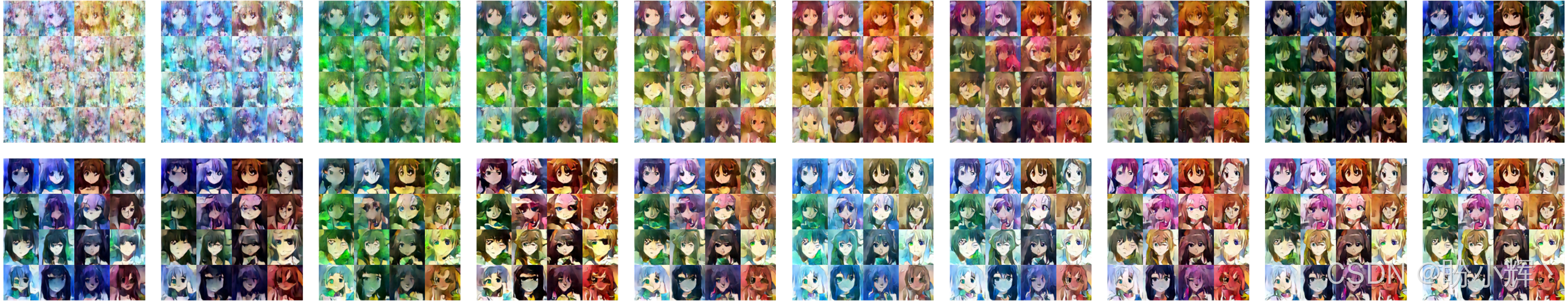 上述代码通过 UNet 模型对初始纯噪点图像进行迭代检测和降噪处理,最终生成逼真动漫图像。我们在每个 epoch 结束时使用固定随机种子生成噪声,并保存 16 张生成图像。固定种子确保每轮 epoch 都生成相同的图像,从而便于比较不同 epoch 间的 DDPM 性能表现。下图展示了 UNet 与 DDPM 训练流程的演进过程: