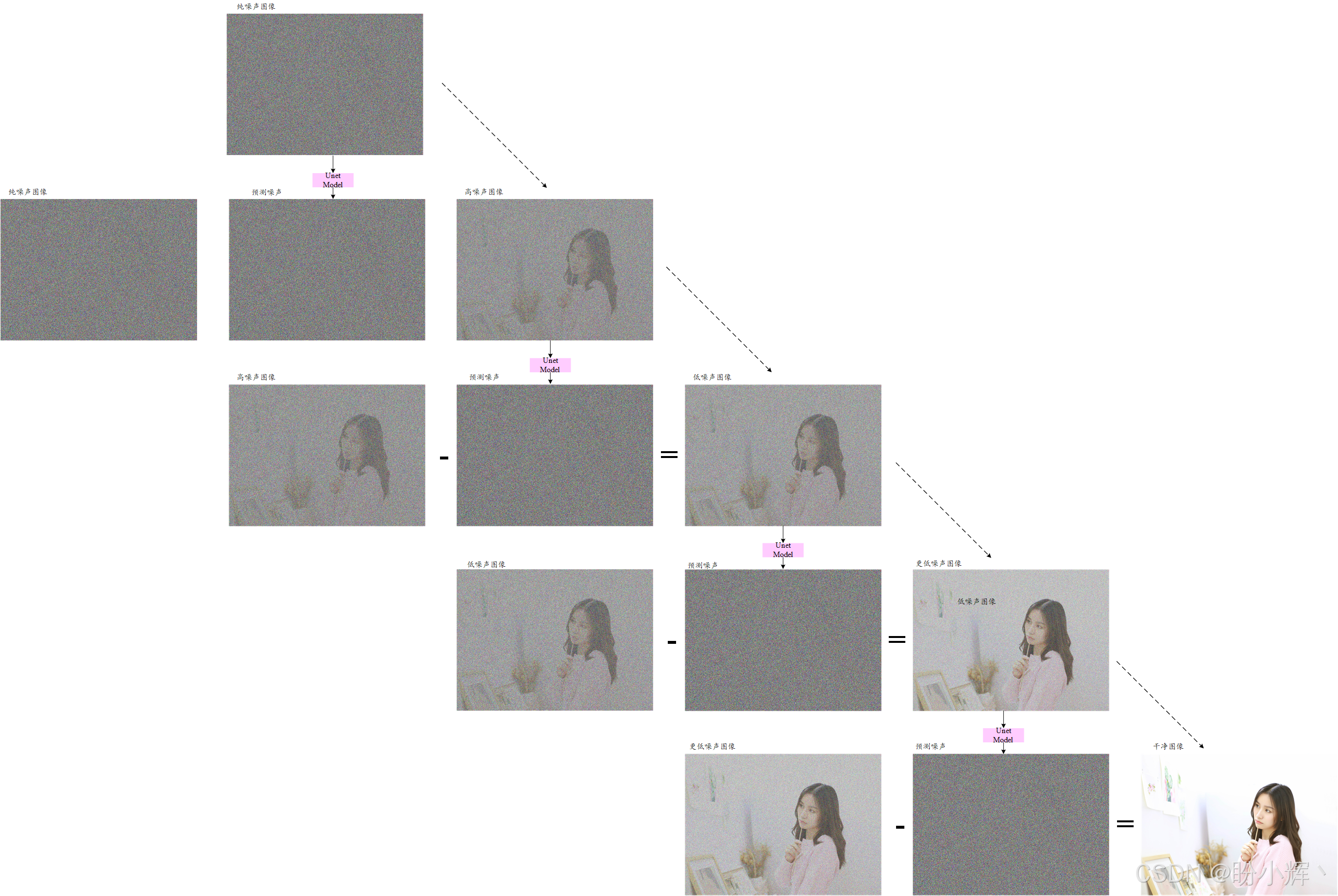 若从纯噪声出发,并重复足够次数的逆向扩散步骤,最终就能生成高质量逼真图像。整个过程通过渐进式微调实现:原始噪声图像本质上是有效内容与极端噪声的叠加,视觉效果近乎纯噪声。而经过训练的 UNet 模型能够精确提取其中的纯净噪声成分,这正是模型被训练优化的核心目标。