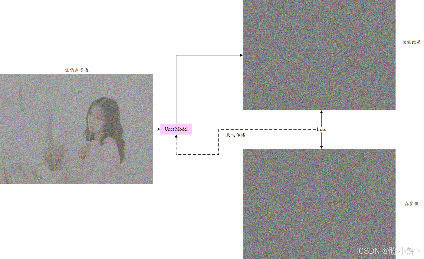 与以上生成的输入和输出图像对类似,我们可以通过使用不同的真实图像并向其添加噪声来生成大量用于 UNet 模型训练的数据集样本。
