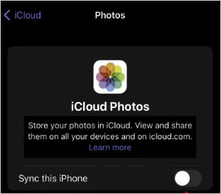 步骤1. 如果您之前没有上传过 iPhone 照片到 iCloud,请先上传。要将照片上传到 iCloud,您需要打开设备上的**"设置"** 应用程序,点击您的用户名 ,选择iCloud 选项,点击**"照片"** 按钮,然后启用**"同步此 iPhone"**功能。