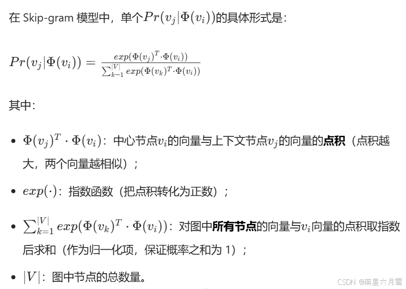 - 对每个节点序列,将其作为 "句子",用 Word2Vec 的 Skip-gram 模型训练:目标是最大化 "给定中心节点zi,预测其窗口内(窗口大小w)上下文节点的概率";