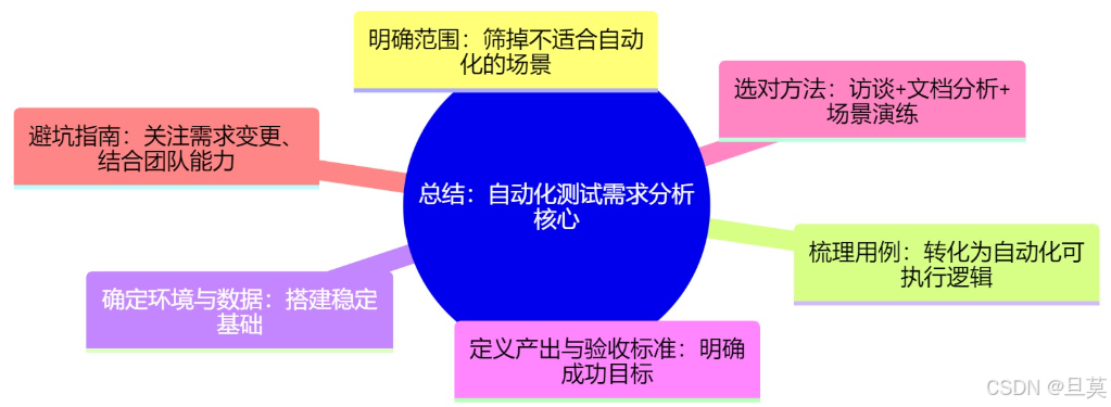 很多团队做自动化测试,只关注"脚本能不能跑通",却忽略了"跑通之后能产出什么""怎么判断自动化测试做成功了"。这部分需求分析要明确测试产出物和验收标准,避免后续出现"做了半天不知道有没有用"的情况。