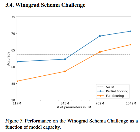 近期,陈庭和乐(Trinh & Le, 2018)借助语言模型在该任务上取得了显著进展,其核心方法是让模型对歧义消解的正确结果输出更高的预测概率。我们沿用了他们提出的问题建模方式,并在图 3 中分别展示了模型在全评分法 与部分评分法两种评估方式下的性能表现。GPT-2 模型将该任务的当前最优准确率提升了 7 个百分点,最终达到 70.70%。需要说明的是,该数据集规模极小,仅包含 273 个样本,因此我们建议读者参考特里谢莱尔等人(Trichelair et al., 2018)的研究,以更全面地理解本研究结果的背景。