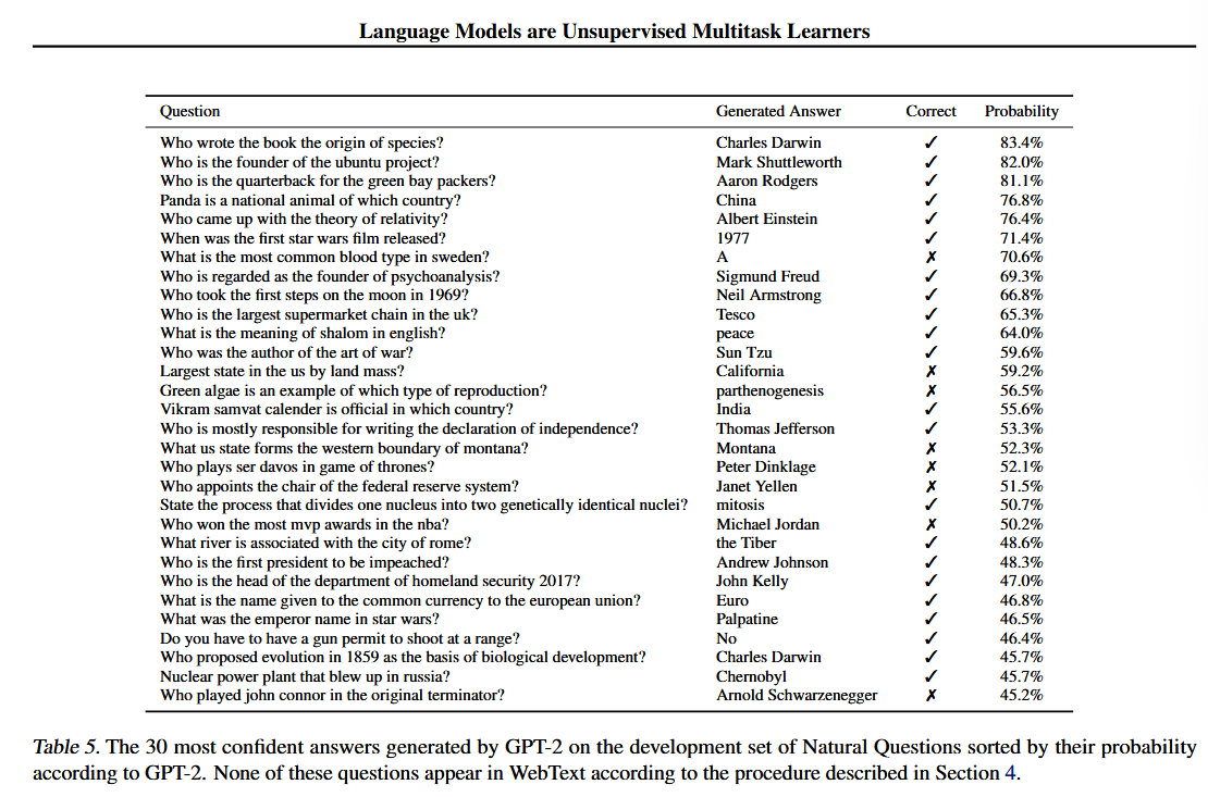 GPT-2 为生成答案分配的概率具有良好的校准性:在模型最有把握回答的 1% 的问题上,其准确率达到了 63.1%。表 5 展示了 GPT-2 针对开发集问题生成的 30 个置信度最高的答案。尽管表现有所突破,但相较于结合信息检索与抽取式文档问答技术的开放域问答系统(阿尔贝蒂等人,2019)所能达到的 30%---50% 的准确率区间,GPT-2 的性能仍存在巨大差距。(Factoid-style questions事实类问题,Qualitative results定性分析结果,Quantitative test定量测试,Well calibrated概率校准性良好)