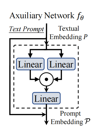 训练阶段使用辅助网络优化文本嵌入,推理阶段辅助网络输出的嵌入特征P(C×D)与最后一层卷积核K(D×D'×1×1)融合生成新的卷积核K',公式如下: