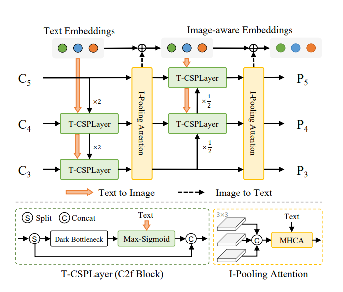 其中O(Object Embeddings):锚点的对象嵌入矩阵,形状为N×D,其中N为锚点总数(N=H×W,H/W为特征图尺寸),D为则为每个锚点的嵌入的特征向量。P(Prompt Embeddings):提示嵌入矩阵,形状为C×D,其中C为提示的数量,D为提示的嵌入维度。通过矩阵乘法获得最终的Label[N,C],表示第N个锚点与第C个提示的匹配分数。