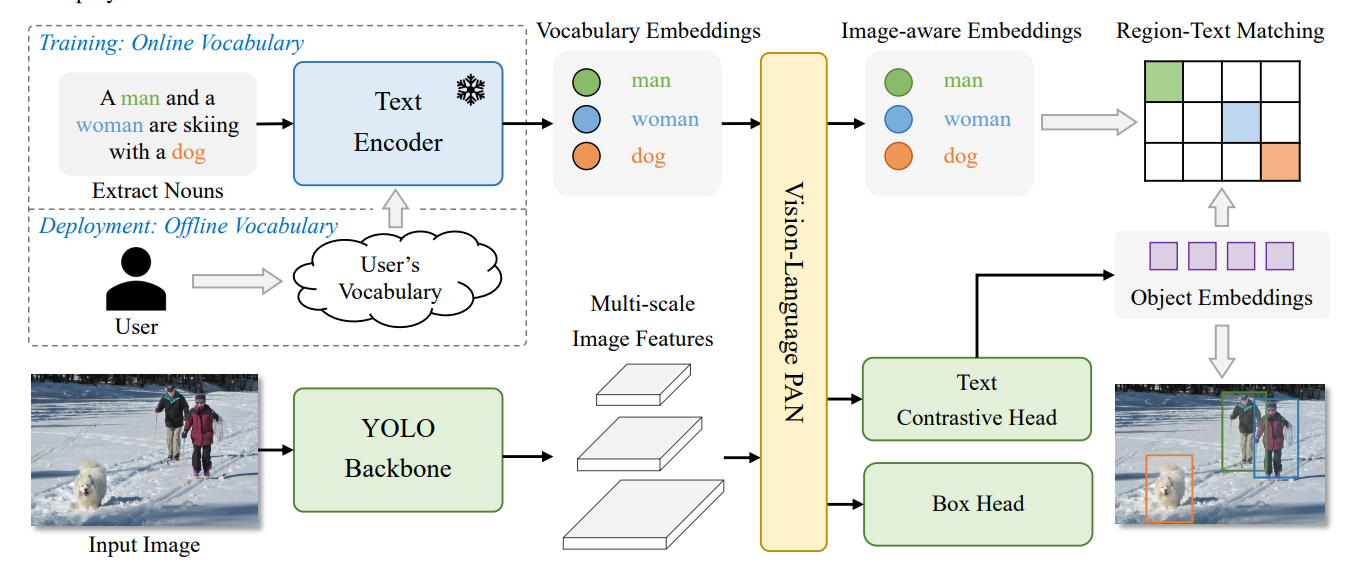 **对于无提示场景:**引入懒区域 - 提示对比(LRPC)策略,利用内置的大型词汇表和专用嵌入识别所有对象,避免对昂贵语言模型的依赖