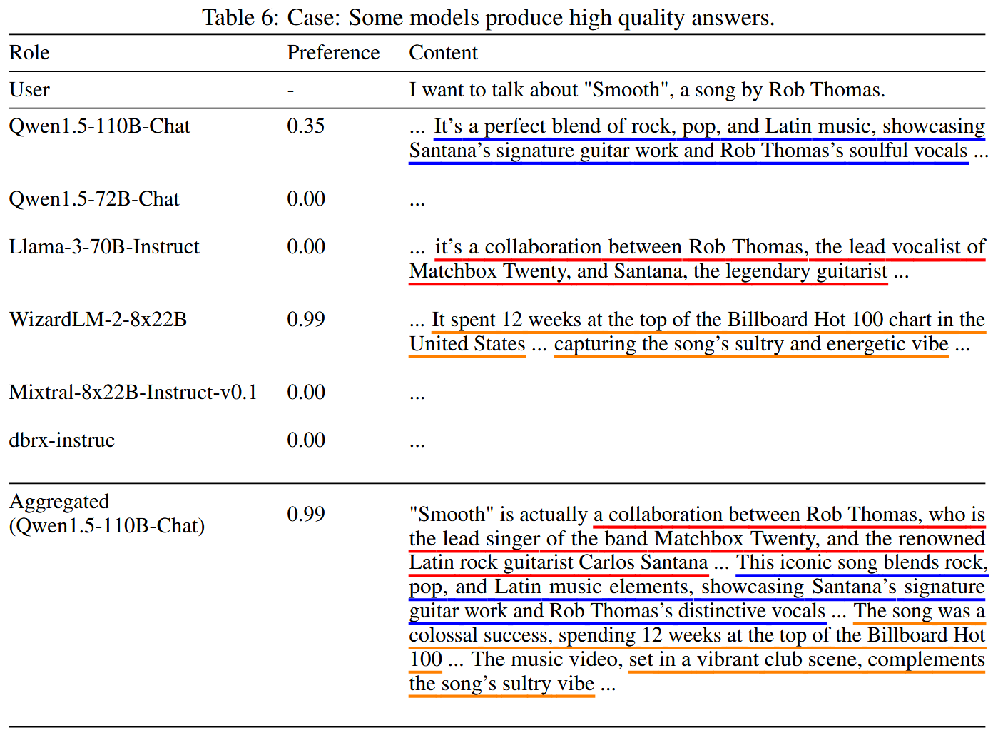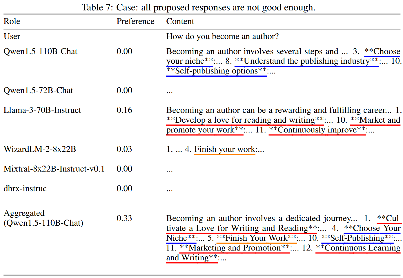 表 6 展示当 proposer 中存在高质量答案时,aggregator 会在保留自身强项的同时吸纳其他模型的关键点,最终偏好分数可达到与最佳 proposer 相同的 0.99