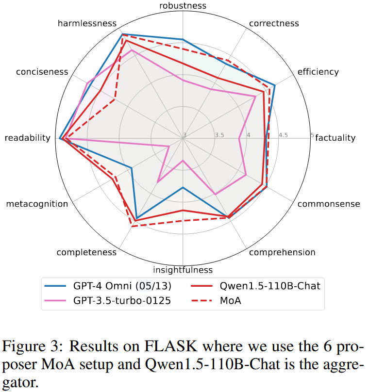 在 AlpacaEval 2.0、MT-Bench 与 FLASK 等基准上做了系统评测,给出"纯开源模型 MoA"也能超过当时的 GPT-4 Omni 的结果,并报告了不同配置(MoA、MoA-Lite、MoA w/ GPT-4o)的性能与代价权衡。