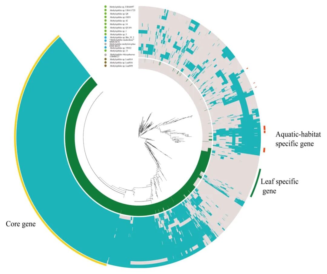 图3基于 18 株 Methylophilus 属菌株的 3994 个直系同源基因簇的存在/缺失模式构成,包含1035 个单拷贝基因构建的系统发育树、水生栖息地特异性基因、叶表特异性基因、核心基因,叶表和水生栖息地菌株基因组;菌株的分离来源。结果显示菌株按生境聚类为水生群和叶表群,存在显著栖息地特异性基因差异,揭示生态位分化与基因组功能的关联。