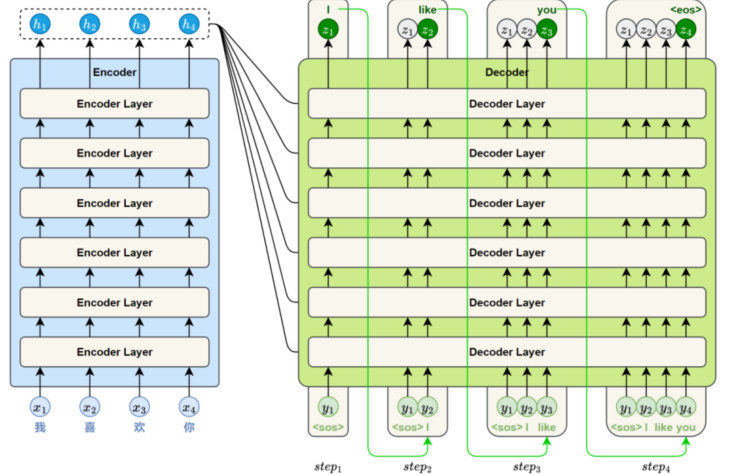 此外,Transformer 的编码器和解码器模块分别由多个结构相同的层堆叠而成。通过层层堆叠,模型能够逐步提取更深层次的语义特征,从而增强对复杂语言现象的建模能力。标准的 Transformer 模型通常包含 6个编码器层和 6 个解码器层。