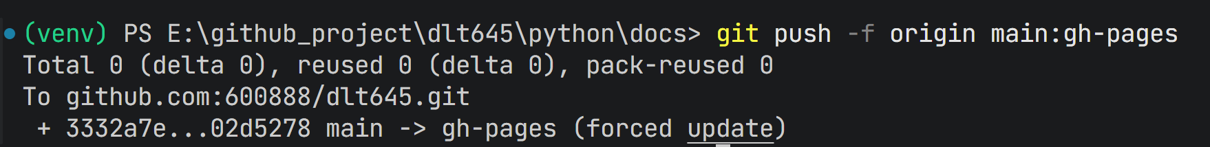 gh-pages分支# 添加所有文件 git add . # 提交 git commit -m "Deploy Sphinx documentation to GitHub Pages" # 推送到远程仓库 git push -f origin main:gh-pages