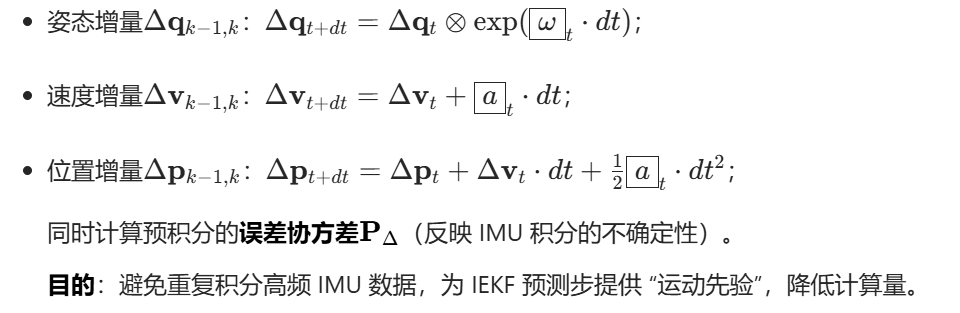 2.IMU预积分计算:相邻激光帧()间的校准后IMU数据,对其进行预积分,计算相对运动增量。