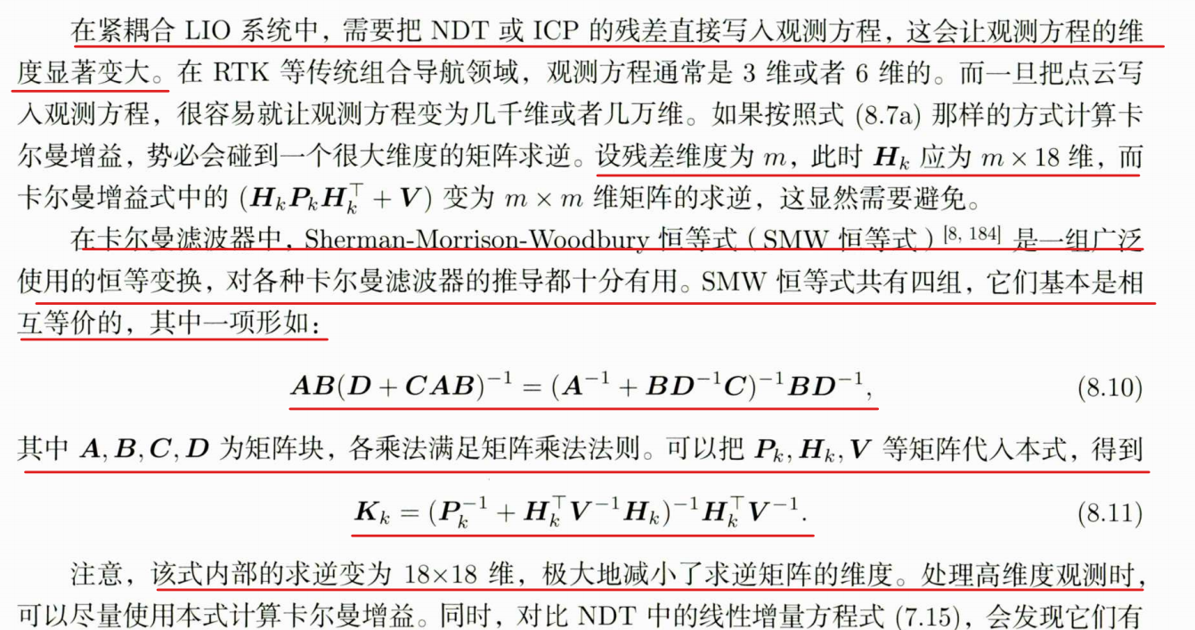 5.LIO的特殊点:紧耦合 LIO 中,每次迭代都要重新找激光点的匹配对象,导致观测数据的数量会变(不像普通 EKF 是固定的);观测数据太多时,得把 EKF 的公式变形,才能处理数据量太大的问题。