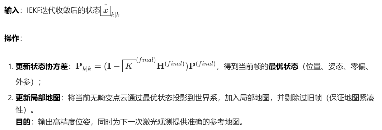 上述步骤会随每帧激光数据重复执行,形成"预处理→预积分→预测→观测→迭代修正→地图更新"的循环,最终实现"IMU高频跟踪+激光高精度修正"的紧耦合LIO位姿与地图估计。