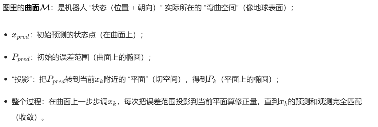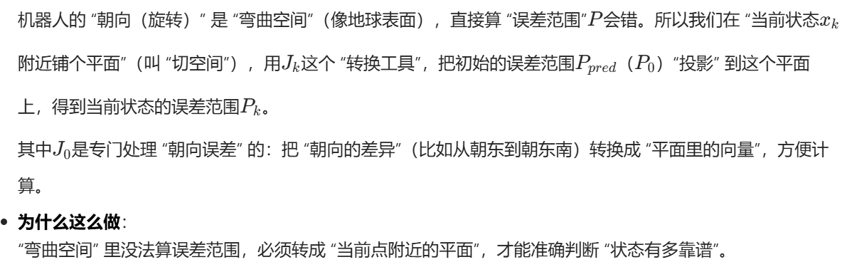 但这里有个麻烦:机器人的 "朝向(旋转)" 不是 "平坦的平面"(比如朝东→朝东南不是简单的加法),而是 "弯曲的空间"(像地球表面,走直线其实是曲线)。所以 "状态的误差范围" 不能直接算,得做特殊处理 ------ 这就是下面要解决的核心问题。(好难看不懂)