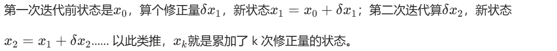 2.观测与增益的更新:因为要反复迭代,每次都得重算卡尔曼增益、观测关系;当前的基准状态,是从初始点累加每次修正量得到的 ------ 可以理解为:"这次迭代的基准状态是 ,算完修正后误差就清零,下次从新基准继续"。