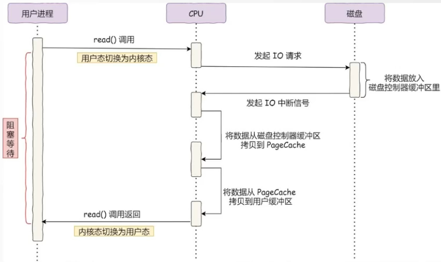 如果用户要从磁盘读取数据(比如kafka消费消息),必须先把数据从磁盘拷贝到内核缓冲区 ,然后在从内核缓冲区到用户缓冲区 ,最后才能返回给用户。