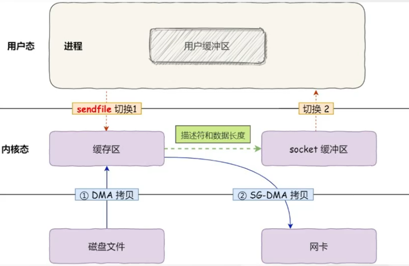 在Linux操作系统里面提供了一个sendfile函数(并不是所有操作系统都支持sendfile),可以实现"零拷贝"。这个时候就不需要经过用户缓冲区了,直接把数据拷贝到网卡(这里画的是支持SG-DMA拷贝的情况)。因为这个只有DMA拷贝,没有CPU拷贝,所以叫做"零拷贝"。零拷贝至少可以提高一倍的性能。