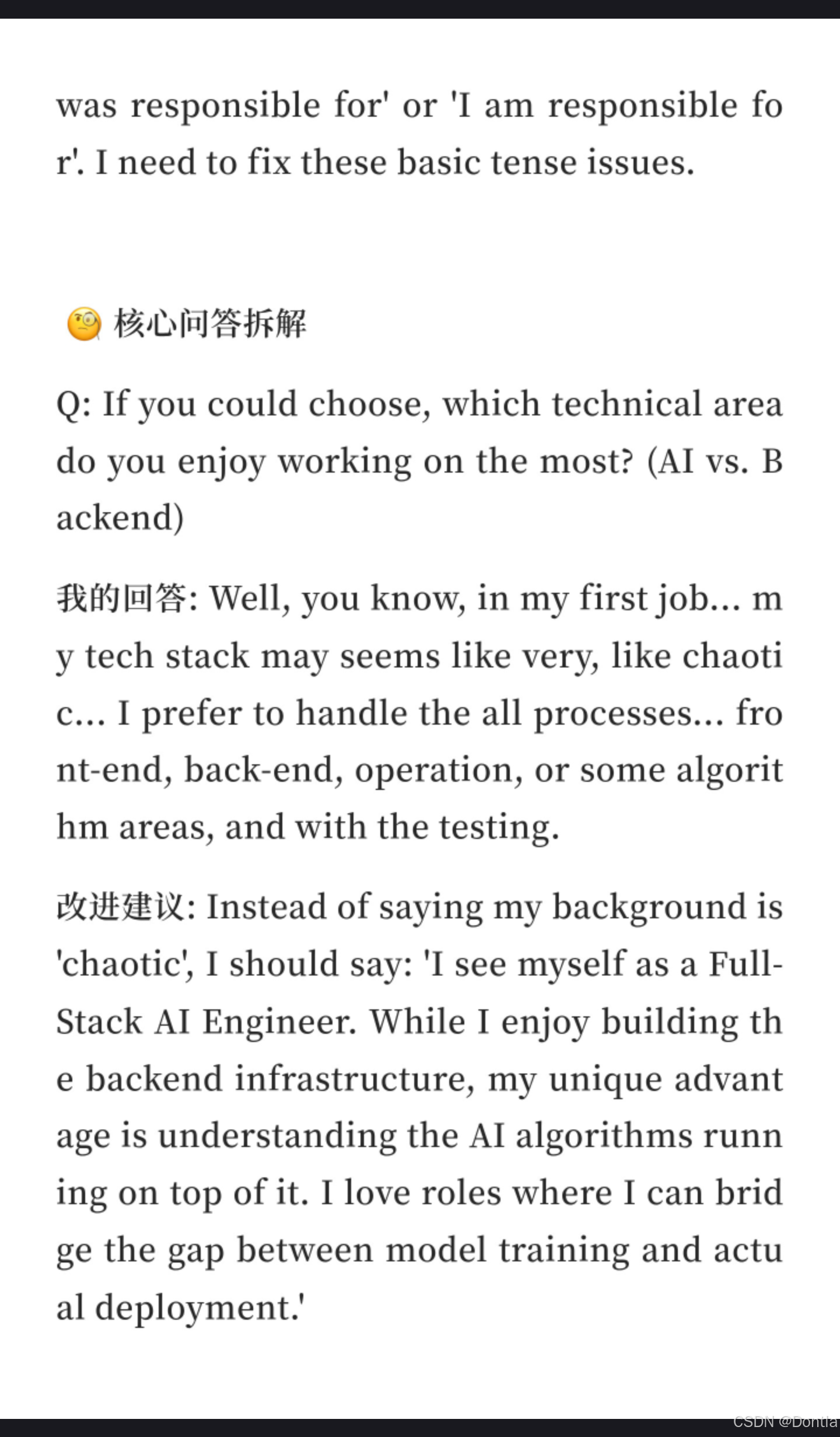 改进建议: Instead of saying my background is 'chaotic', I should say: 'I see myself as a Full-Stack AI Engineer. While I enjoy building the backend infrastructure, my unique advantage is understanding the AI algorithms running on top of it. I love roles where I can bridge the gap between model training and actual deployment.'