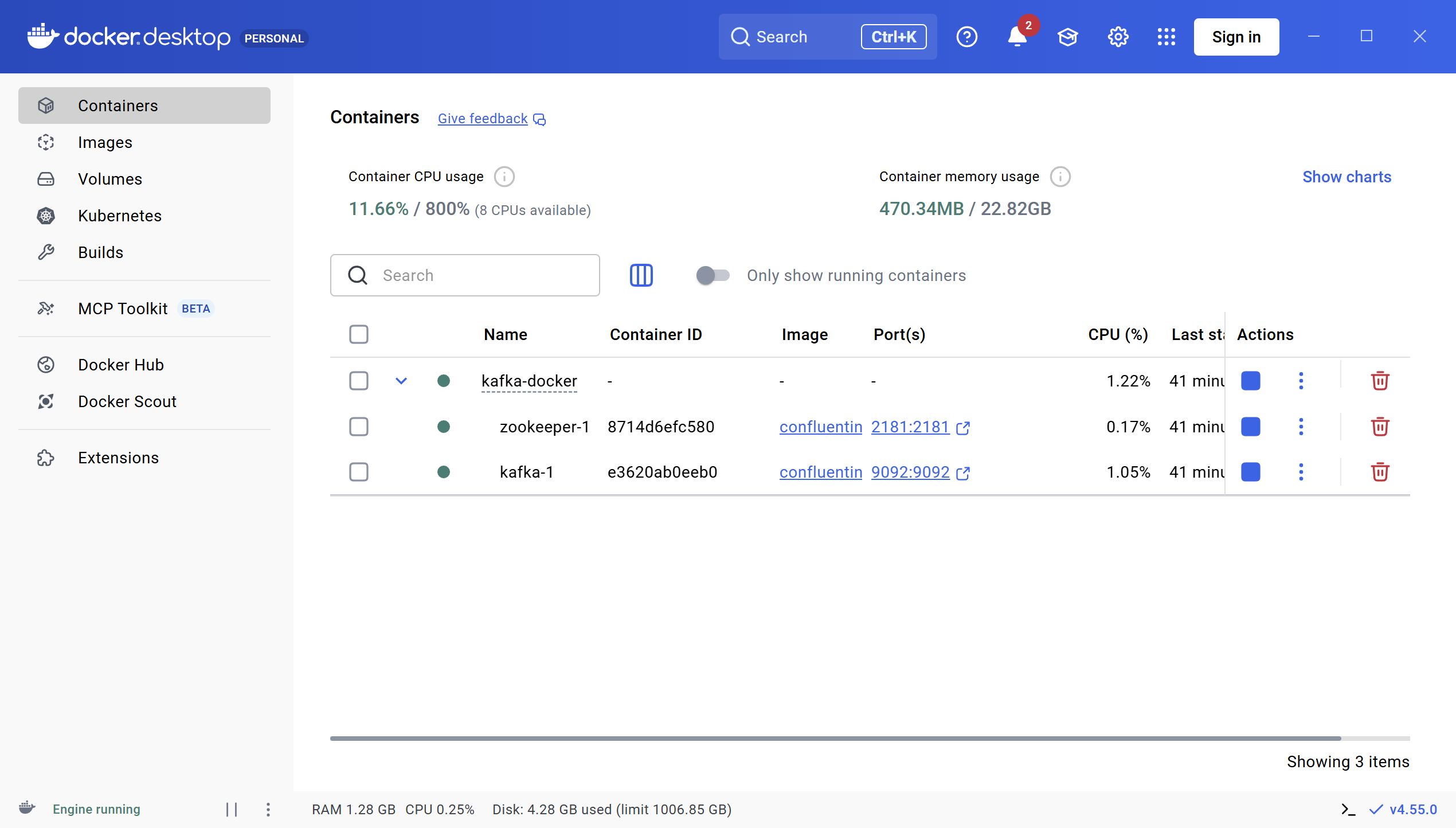 Containers页面,确认zookeeper和kafka容器状态为Running; -