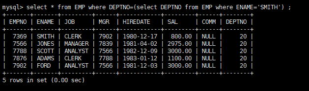where (deptno,job)=(select deptno,job from EMP where ename='SMITH')